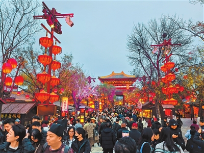 11月22日晚,开封清明上河园景区内,上善门在暮色中华灯初亮,流光溢彩的宋式建筑吸引全国游客前来观赏,让人沉浸于繁华汴京的夜游盛景之中。