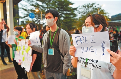 11月30日,义工在香港大埔广福休憩处举牌提供免费拥抱,提供心理疏导。新华社记者 陈铎 摄