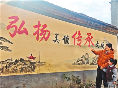 12月4日,鹿邑县卫真街道四新居委会,一位年轻的妈妈正给孩子讲解文化墙上的内容。 郭凯 摄