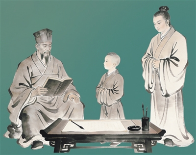 客家祖孙三代人承传族谱的场景。