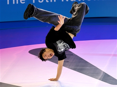 刘清漪在全运会霹雳舞决赛中做出高难度动作。