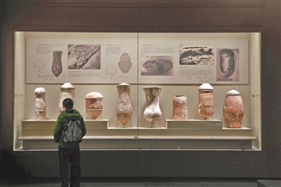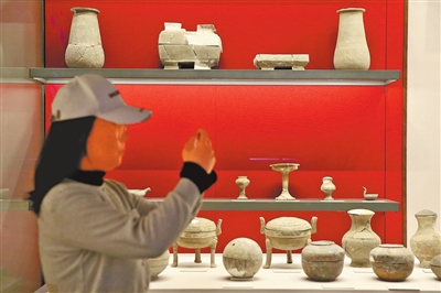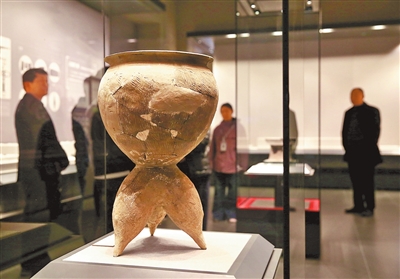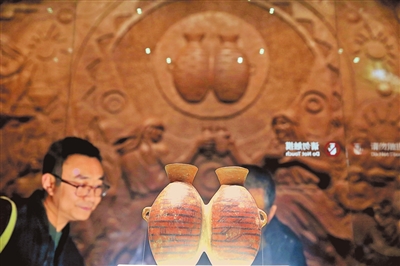 观众在大河村遗址博物馆新馆参观彩陶双连壶展品。