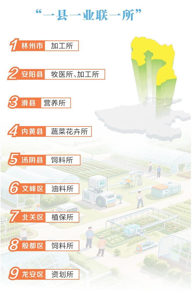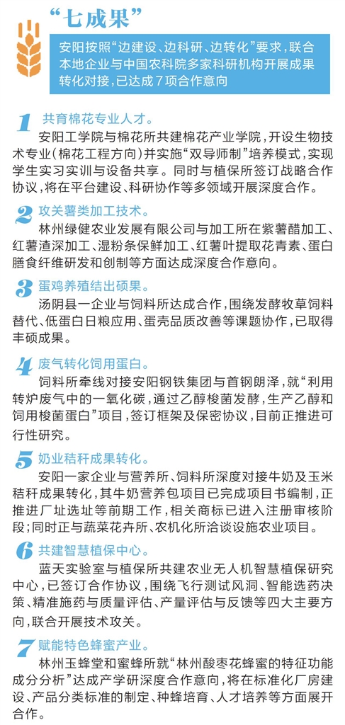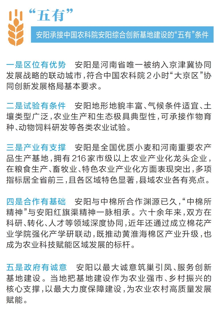 作为中国农科院布局河南的重点战略项目,首批中国农科院作物科学、植物保护、饲料等9个研究所46个科研团队、498名科研人才将陆续入驻安阳综合创新基地。项目实施的重点在于推行“一县一业联一所”模式,重在技术落地、重在成果见效、重在产业升级。
