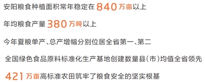 安阳素有“豫北粮仓”之称,是全国优质小麦生产基地,国家粮食、棉花、油料优势种植区域,也是河南重要的果蔬生产基地,花生、红枣、大红袍花椒等名优特农产品闻名全国。安阳粮食种植面积常年稳定在840万亩以上,年均粮食产量380万吨以上,今年夏粮单产、总产增幅分别居全省第一、第二,全国绿色食品原料标准化生产基地创建数量县(市)均值全省领先,421万亩高标准农田筑牢了粮食安全的坚实根基。