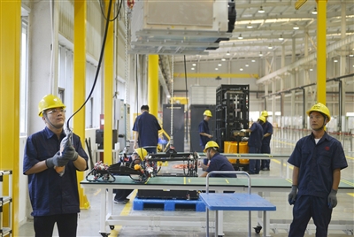 在许继重卡换电科技有限公司生产车间,技术工人们紧张忙碌,一件件“大块头”的充换电设备,正从生产线上鱼贯而出,一片繁忙景象。