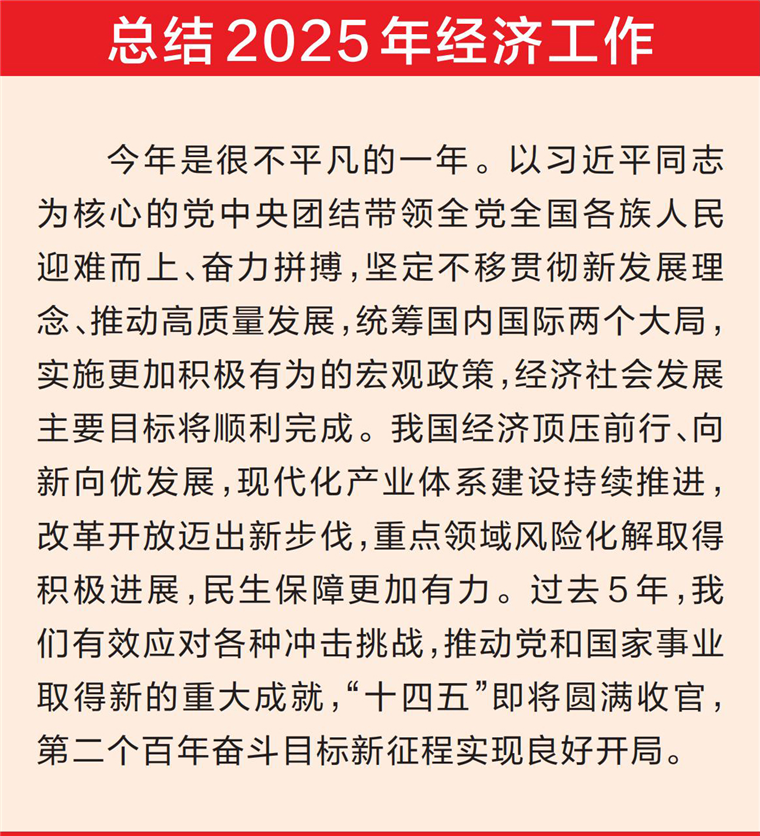 习近平在重要讲话中总结2025年经济工作,分析当前经济形势,部署2026年经济工作。李强作总结讲话,对贯彻落实习近平总书记重要讲话精神、做好明年经济工作提出要求。