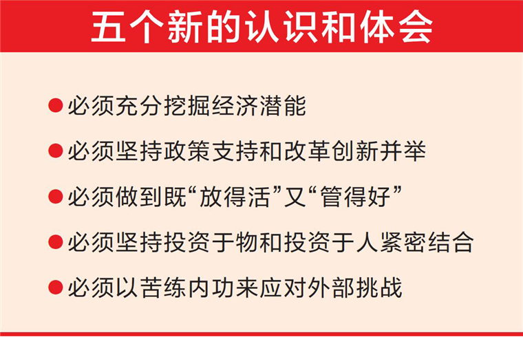 会议认为,通过实践,我们对做好新形势下经济工作又有了新的认识和体会:必须充分挖掘经济潜能,必须坚持政策支持和改革创新并举,必须做到既“放得活”又“管得好”,必须坚持投资于物和投资于人紧密结合,必须以苦练内功来应对外部挑战。