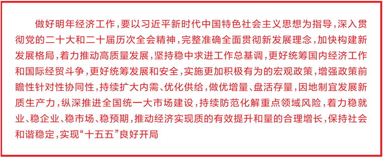 会议强调,要加强党对经济工作的全面领导,形成统一意志和强大合力。要坚持党中央集中统一领导,各地区各部门结合实际、因地制宜,全面落实党中央关于明年经济工作的思路、任务、政策。要树立和践行正确政绩观,坚持为人民出政绩、以实干出政绩,自觉按规律办事,完善差异化考核评价体系。要按照党的二十届四中全会《建议》编制国家和地方“十五五”规划及专项规划,推动高质量、可持续的发展。要营造良好的政治环境、人才环境、营商环境、舆论环境,加强政策宣传解读,充分激发社会正能量。