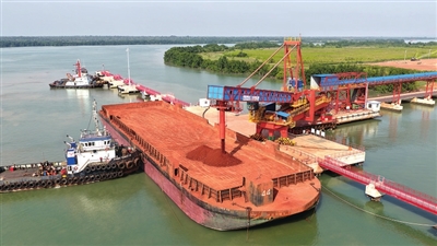 在几内亚努涅兹河畔,由中国河南国际集团建设运营的港口枢纽项目现场,正通过封闭式皮带输送系统进行铝土矿装船作业。
