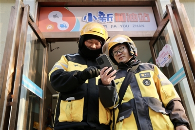 在郑州,外卖小哥通过手机扫码进入小新加油站,奔忙中有了温暖的歇脚处。本报记者 王铮 摄