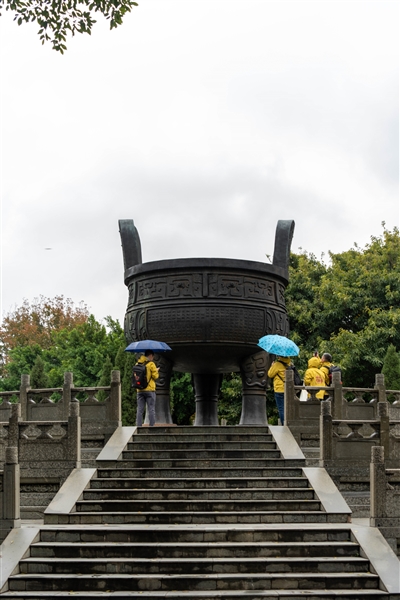 距离江西客家博物院不远处的龟角尾公园里,客家先民南迁纪念坛、纪念鼎临赣江而立。