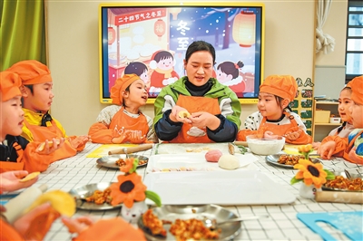 12月18日,商丘市睢县一幼儿园开展“包饺子 知民俗 迎冬至”主题活动。小朋友们在老师的带领下学习揉面团、擀面皮、包饺子等技能,在亲身实践中感知传统民俗,迎接冬至节气。 徐泽源 摄