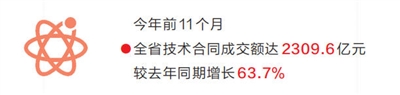 2025年,我省创新能力在全国排名攀升至第12位,创下历史最好成绩。省科技厅最新数据表明,截至11月底,全省技术合同成交额达2309.6亿元,较去年同期增长63.7%。