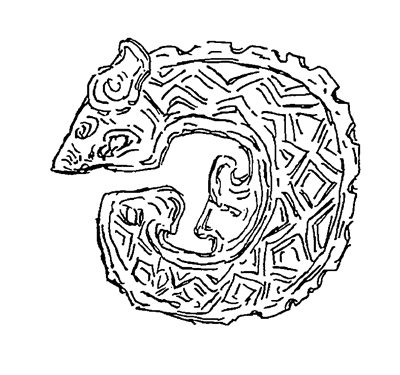 商代玉器,出土于河南安阳殷墟妇好墓。该器长7厘米、厚1.5厘米,墨绿色玉质,采用圆雕与半圆雕工艺,呈蜷曲状头尾相接,尾尖内卷。龙首具宝瓶状双角,细长眉与锯齿状牙齿构成凶猛表情,单阴线刻划的“臣”字形眼呈半球状凸起,腹下两短足与中脊突起增强立体感。身、尾饰菱形纹兼三角纹,背两侧饰三角形纹。背部左右有一对牛鼻小孔,尾尖一面有一未透的圆孔。