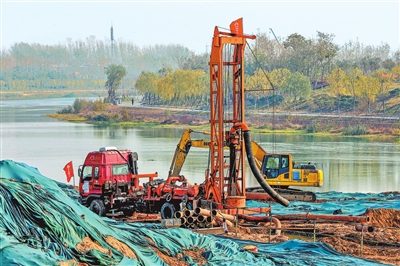 2019年11月21日,郑州贾鲁河两岸铺设截污管网。
