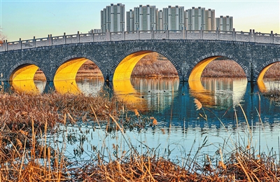 2025年12月14日,在郑州市陇海西路与丹河大道旁的贾鲁河上,一座拱桥的桥洞被金光填满,其倒影在波光粼粼的水面舒展铺陈。