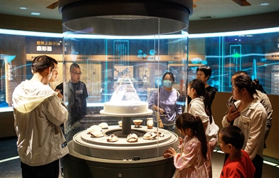 游人在贾湖遗址博物馆观看贾湖骨笛展品。 杨光 摄