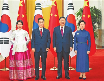 会谈前,习近平和夫人彭丽媛在人民大会堂北大厅为李在明和夫人金惠景举行欢迎仪式。