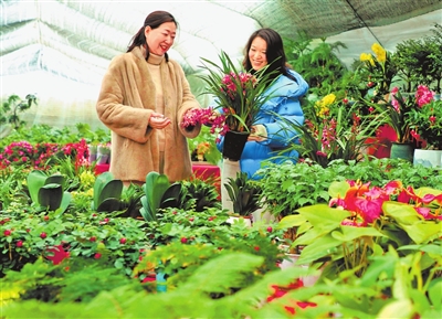 1月5日,南阳市城乡一体化示范区白河街道一家种植园,花农在温室大棚里为顾客介绍花卉品种。高嵩 摄