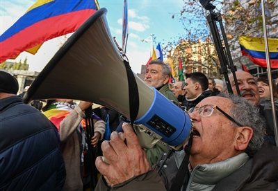 1月4日,民众在西班牙马德里市中心的美国驻西班牙大使馆前,抗议美国对委内瑞拉采取军事行动。新华社记者 程敏 摄