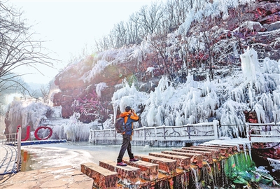 1月6日,郑州新密伏羲山景区大峡谷内,飞瀑流水凝结成层层叠叠的冰挂,在阳光穿透时折射出细碎光斑,似水晶流苏垂落山间,成为中原地区的打卡地。本报记者 邓放 摄