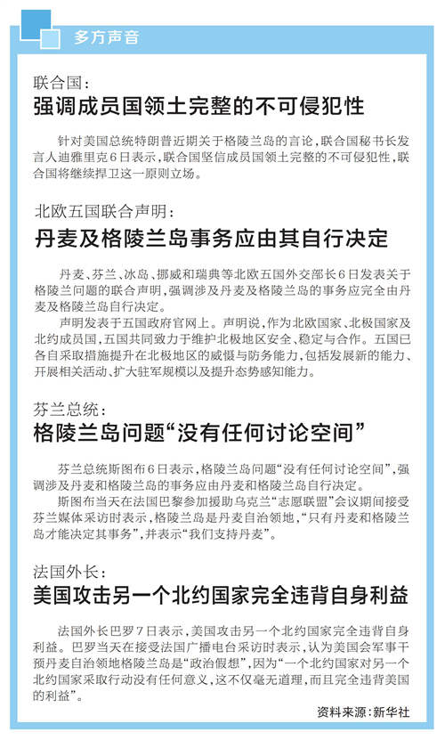 特朗普这番言论引发丹麦等欧洲国家强烈反对。丹麦、法国、德国、意大利、波兰、西班牙和英国6日发表联合声明,强调格陵兰岛属于其人民,只有丹麦和格陵兰岛有权决定涉及其自身的事务。