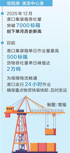 本报讯(记者 卢松 通讯员 李汶哲)1月9日,记者从信阳港·淮滨中心港区获悉,2025年度,港区累计完成货物吞吐量501.7万吨,同比增长288.46%,呈现爆发式增长态势。2025年12月,集装箱吞吐量突破7000标箱,创下单月历史新高。