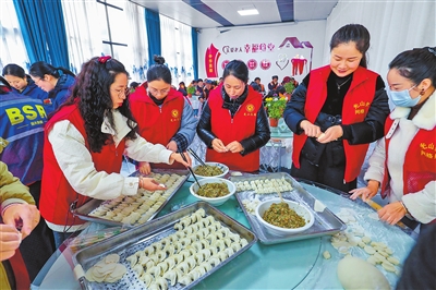 信阳市光山县紫水街道办事处解放街社区举办“饺子宴迎新年”志愿服务活动,为外卖员、快递员等新就业群体送上关爱。 谢万柏 摄
