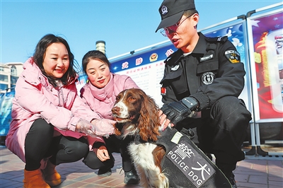 1月10日,在武陟县人民广场,群众与警犬互动。 王琳锋 摄