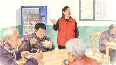 图① 幸福大食堂里,老人吃上热气腾腾的免费午餐。