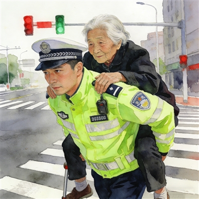 图④ 安阳民警背老人过马路。 本版图片均为AI处理