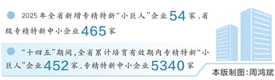 本报讯(记者 陈辉)1月12日,记者从省工业和信息化厅获悉,2025年全省新增专精特新“小巨人”企业54家、省级专精特新中小企业465家。“十四五”期间,全省累计培育有效期内专精特新“小巨人”企业452家、专精特新中小企业5340家。
