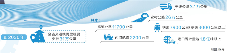 到2030年,全省交通线网里程要突破31万公里,其中:高速公路11700公里、干线公路3.1万公里、农村公路26万公里,内河航道2200公里,铁路7900公里(高铁3000公里以上),港口吞吐量达1.8亿吨以上,公、铁、水货运量比例由88.5/4.5/7调整为85.4/5.1/9.5,融合化、安全化、数智化、绿色化水平全面提高。