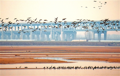 2025年12月21日,郑州万滩黄河公铁大桥一列高铁飞驰而过,群鸟振翅齐飞,掠滩逐水,一幅经济发展与生态共生的画面。 王艳萍 摄