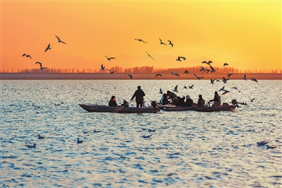 1月11日傍晚,平顶山市白龟湖国家湿地公园,游客在渔船上与红嘴鸥嬉戏,呈现出一幅人与自然和谐共生的美丽画面。 朱东阳 摄
