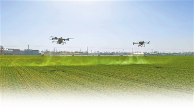 商丘市睢县皇台村高标准农田内,植保无人机正对冬小麦进行高效施肥与除草作业,开展精准“飞防”冬管。 徐泽源 摄