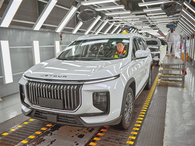 图② 技术工人在奇瑞汽车河南有限公司的总装生产线上忙碌。本报记者 史长来 摄