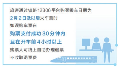 国铁集团客运中心相关负责人介绍,购票人通过铁路12306平台,使用电子支付或积分支付购买乘车日期为2月2日及以后境内旅客列车、始发或终到站为香港西九龙的跨境旅客列车火车票时,如在操作中发生误购,可在购票支付成功30分钟内且在开车前4小时以上,自行线上免费办理退票;购票人如使用电子支付购票,票款将按原渠道退还;如使用积分购票,将按原渠道返还积分,返还积分的有效期不变;同一购票人在一个自然日内限办1个订单误购免费退票业务,改签车票、预约或候补购票等不办理此业务。