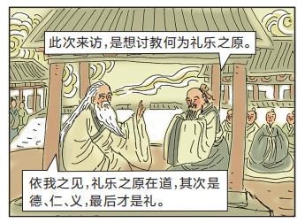 孔子临出发时告诉弟子南宫敬叔说:“吾闻老聃博古知今,通礼乐之原,明道德之归。”后世推论,此次讨论可能是围绕“礼乐之原、道德之归”。