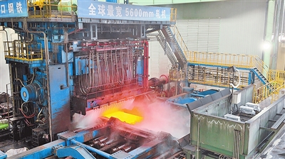 图① 周钢的全球首条5600毫米超宽轧机宽厚板生产线全速运转,钢板被精准展宽压薄。 段九君 摄