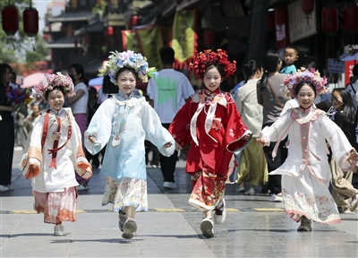 小朋友身着汉服在曹魏古城游玩。 牛书培 摄