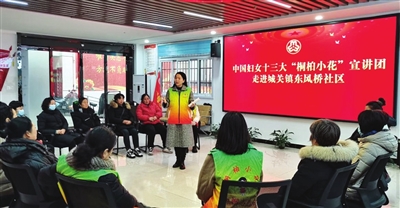 南阳“桐柏小花”宣讲团成员向社区妇女群众宣讲中国妇女十三大精神。受访者供图