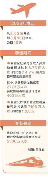 2026年春运从2月2日开始,到3月13日结束,为期40天。今年春节是个“大年”,共有9天假期,预计群众返乡、探亲、旅游的出行意愿将更加强烈。春运期间,预计我省全社会跨区域人员流动量达到6.73亿人次,同比增长4.7%,客流规模有望创历史新高,其中铁路预计发送旅客2773万人次,民航旅客吞吐量预计达到400万人次。