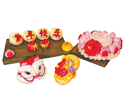 新春将至,内黄县顺河路一家手工花馍店内,元宝福马等造型花馍格外醒目,浓浓年味扑面而来。 韩聪 摄