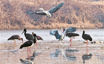 1月29日,在洛阳市孟津黄河湿地国家级自然保护区,会盟镇黄河湿地区域又迎来38只国宝级候鸟——黑鹳。 郑占波 韩波志 摄
