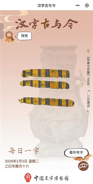 本报讯(全媒体记者 李琳 杨之甜)指尖轻点,便能对话千年甲骨;方寸屏幕,尽览汉字演变脉络。近日,中国文字博物馆打造的“汉字古与今”微信小程序正式上线,为国内外大中小学生及古文字爱好者搭建起一座连接古今的汉字文化桥梁。