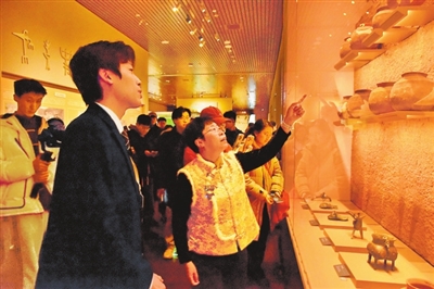 文化学者蒙曼(右一)在殷墟博物馆参观。 彭捷 摄