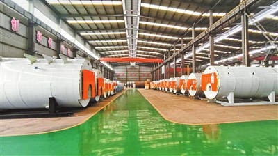 四通锅炉厂房里,制造好的锅炉“整装待发”。 本报全媒体记者 王向前 摄