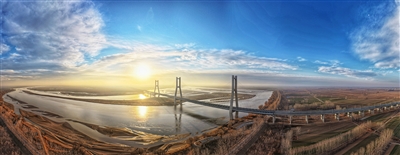 近日,兰考东坝头新建成的跨黄河大桥,在朝霞映射下,熠熠生辉。杨永新 摄