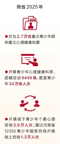 2025年,我省共为2.7万名重点青少年群体建立心理健康档案,完成年度目标任务的134.8%;开展青少年心理健康科普、团辅活动9449场,完成年度目标任务的135%,覆盖青少年34万余人次;开展线下青少年个案心理咨询3.9万人次,通过河南省12355青少年服务热线开展线上咨询1.3万人次,分别完成年度目标任务的157.7%和127.3%。